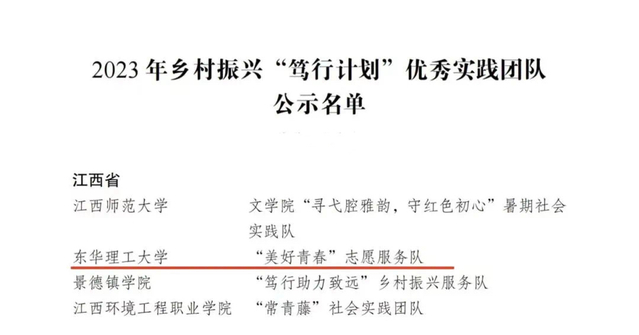 近日,共青团中央通报表扬一批在2023年全国大中专学生“三下乡”社会实践活动之乡村振兴“笃行计划”专项行动中表现突出的优秀单位和团队,东华理工大学团委荣获2023年优秀组织单位(全省仅2个),“美好青春”志愿服务队荣获优秀实践团队称号(全省仅4支),获奖数量居全省高校第一。
