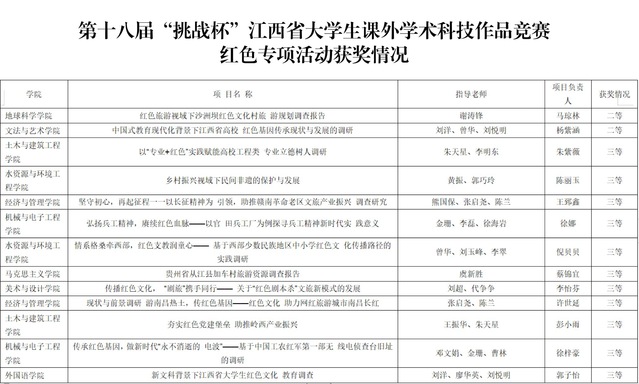 近日,共青团江西省委、江西省科学技术协会、江西省教育厅、江西省社会科学院、江西省学生联合会联合公布了第十八届“挑战杯”全国大学生课外学术科技作品竞赛红色专项活动省赛结果,东华理工大学荣获二等奖2项、三等奖11项。