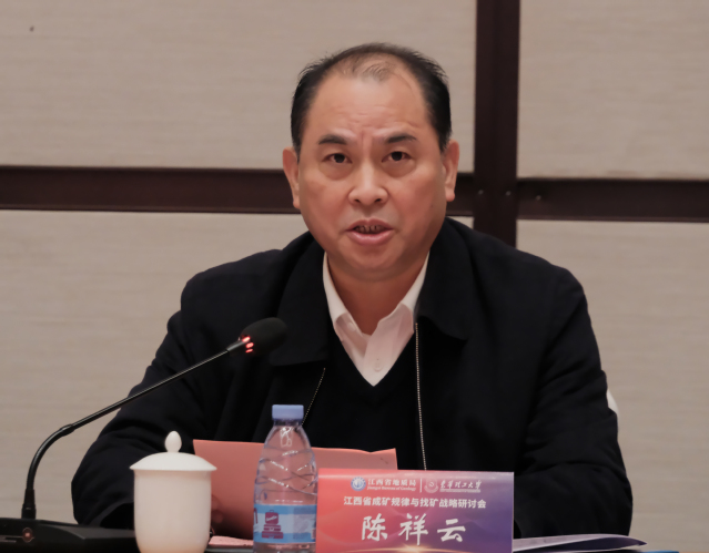 陈祥云代表江西省地质局致辞。他对东华理工大学长期以来在科技创新、平台建设、人才培养与输送等方面给予江西省地质局的大力支持表示感谢。他指出,江西省地质局将以战略思维谋划全局,围绕国家能源资源安全保障,充分发挥找矿主力军作用,期望双方深化全方位的产学研合作,加大战略性关键金属矿产、关键靶区的合作勘查力度,在新一轮找矿突破战略行动中再立新功。