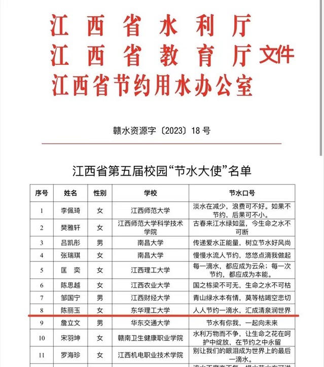 本次活动吸引了全省各高校大学生积极参与,经过学校推荐、省厅各部门联合初审和公众网络票选,东华理工大学陈丽玉同学从69位入围候选人中脱颖而出,荣获江西省第五届校园“节水大使”称号。
