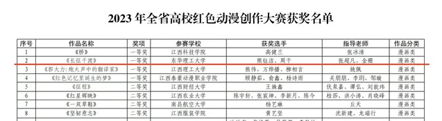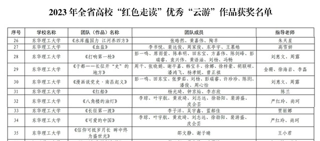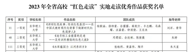 东华理工大学参赛作品《讲好红色故事传承红色基因——在中国式教育现代化背景下做新时代红色筑梦人》《追寻核工业前辈的足迹——吴有训科教馆的红色之旅》《水库蕴国力 江河养四方》分获实地走读作品一等奖、二等奖和三等奖;《长征千渡》获红色动漫作品一等奖;在红色走读云游作品中,学校选送的《血盐》《长征第一渡》等10个作品均获表彰。