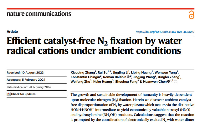 近日,由东华理工大学质谱研究团队联合江西中医药大学、吉林大学完成的研究成果“Efficient catalyst-free N2 fixation by water radical cations under ambient conditions ”在Nature子刊《Nature Communications》上发表。东华理工大学江西省质谱科学与仪器重点实验室张小平副教授为论文的第一作者,陈焕文教授为通讯作者。