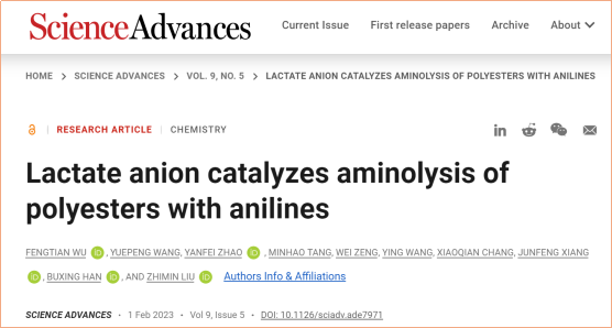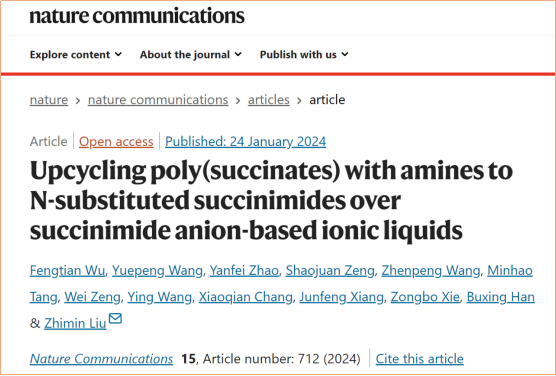 近期,东华理工大学绿色化学与技术研究团队联合中国科学院化学所刘志敏研究员团队在聚酯类塑料的绿色降解领域研究中,取得了系列创新性成果。团队研究成果“Lactate anion catalyzes aminolysis of polyesters with anilines”在Science子刊《Science Advances》上发表,东华理工大学化学与材料学院吴丰田博士为论文第一作者,中国科学院化学研究所刘志敏研究员为通讯作者;“Upcycling poly(succinates) with amines to N-substituted succinimides over succinimide anion-based ionic liquids在Nature子刊《Nature Communications》上发表,吴丰田博士为论文第一作者,刘志敏研究员为通讯作者。