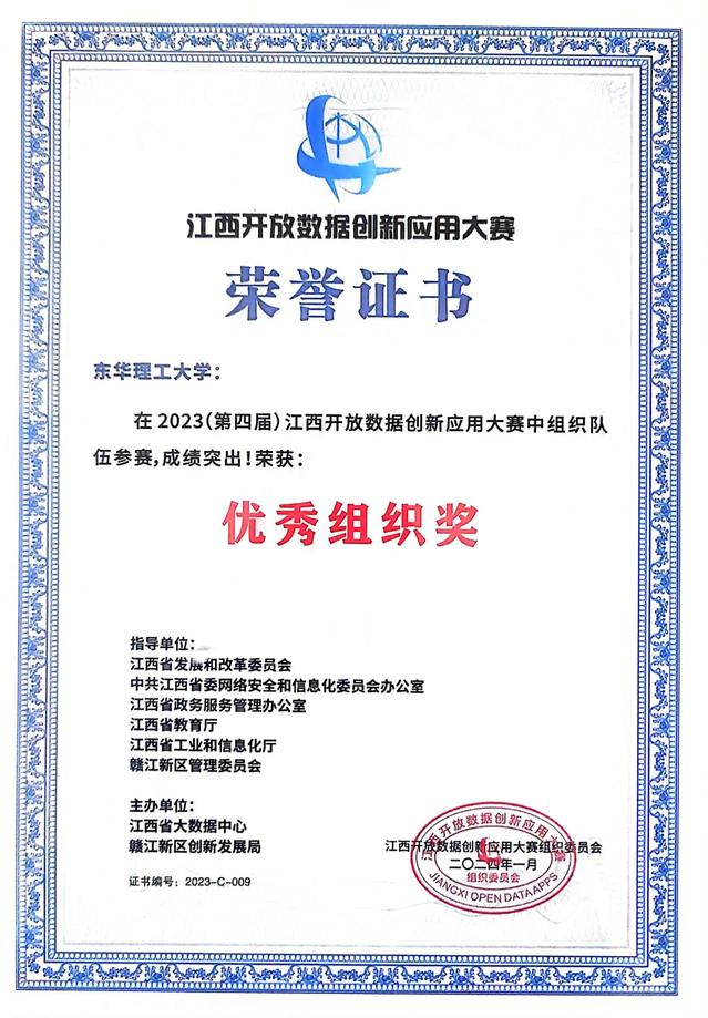 3月13日,由省发展改革委、省委网信办、省政务服务办、省教育厅、省工信厅、赣江新区管委会共同指导,省大数据中心和赣江新区创新发展局联合主办的2023(第四届)江西开放数据创新应用大赛颁奖仪式在赣江新区举行。东华理工大学参赛项目荣获三等奖1项、优秀奖1项,并获大赛“优秀组织奖”(全省仅有三所高校)。