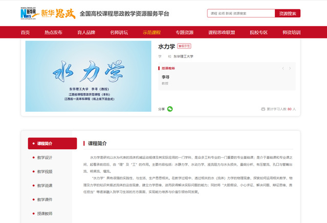 近日,东华理工大学水资源与环境工程学院李寻教授主讲的《水力学》课程思政示范课程成功上线新华网“新华思政—全国高校课程思政教学资源服务平台”,面向全社会开放及共享教学设计、教学视频、教学说课、教学课件等教学资源,标志着学校课程思政建设工作取得新的进展。