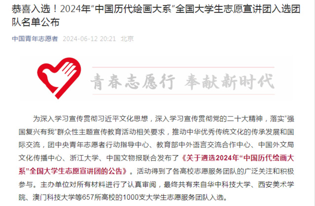 6月12日,2024年“中国历代绘画大系”全国大学生志愿宣讲团名单公布。东华理工大学文法与艺术学院“灯塔”志愿宣讲团、“艺路同行”志愿宣讲团和“文法绘韵 艺启童行”志愿宣讲团3支团队入选,入选数量位居全省高校第一。