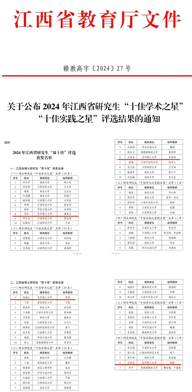 近日,江西省教育厅下发《关于公布2024年江西省研究生“十佳学术之星”“十佳实践之星”评选结果的通知》(赣教高字〔2024〕27 号),东华理工大学4名研究生榜上有名。其中,东华理工大学地球科学学院2021级博士闵壮、水资源与环境工程学院2022级博士王泽成分别荣获2024年江西省博士研究生“十佳学术之星”与“十佳实践之星”,化学与材料学院2021级硕士张晴云荣获硕士研究生“十佳学术之星”,水资源与环境工程学院2021级硕士王师齐获硕士研究生“十佳实践之星提名奖”,创学校历史最好成绩。