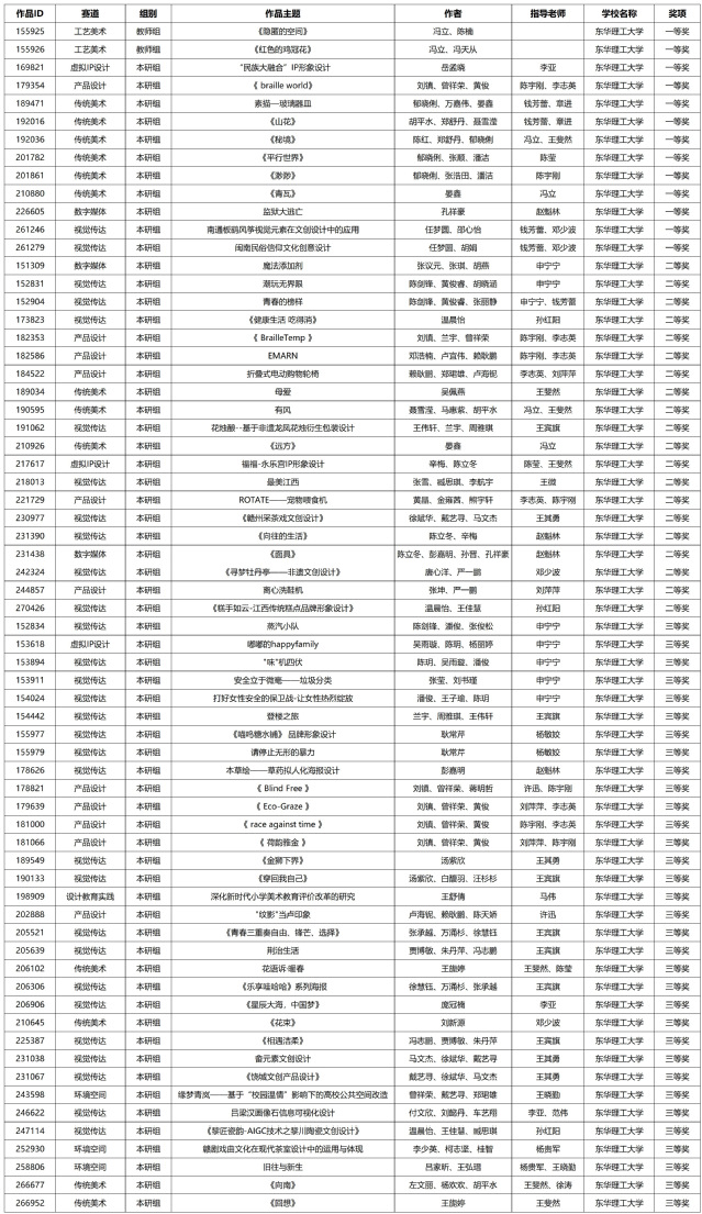近日,2024年第八届米兰设计周——中国高校设计学科师生优秀作品展国赛评审落下帷幕,东华理工大学作为大赛江西赛区的承办单位,积极组织师生参与备赛。通过国赛评选,学校师生荣获国家级奖项21项(学生组):一等奖3项、二等奖4项、三等奖14项;获省级奖项66项:一等奖13项(其中教师组2项,学生组11项)、二等奖20项、三等奖33项。