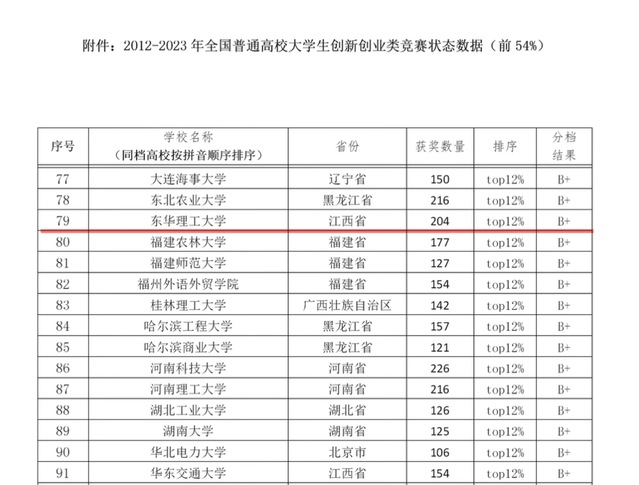 近日,高校教师教学发展研究国家级虚拟教研室联合浙江大学教育学院共同发布了《全国普通高校创新创业类竞赛指数》,在1145所本科高校中,东华理工大学跻身2022-2023年全国普通高校大学生创新创业类竞赛全国top12%行列,排名位列江西省属高校第三。