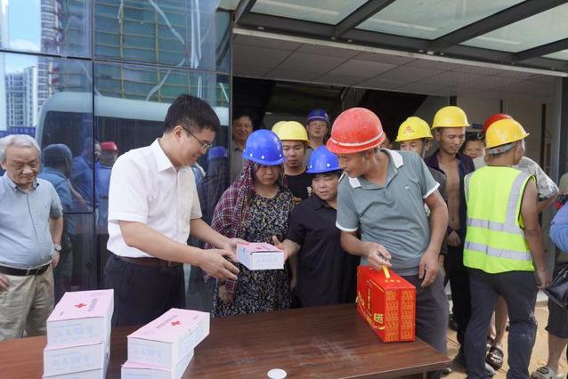 在工地现场,张福庆为一线施工人员送上藿香正气水、龙虎人丹、凉茶等防暑降温物资,并带去学校的关心与慰问。他对工人师傅的辛苦工作与辛勤付出表示感谢,细心叮嘱他们加强防暑降温和自我防护,注重劳逸结合,以更加饱满的热情和更加昂扬的精神状态投入项目建设。