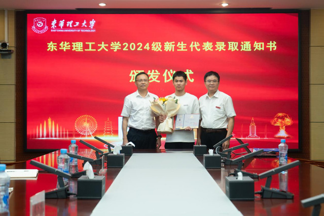 7月27日,东华理工大学2024级本科新生第0001号录取通知书颁发仪式在行政楼401室举行。校党委书记张福庆为2024级本科新生程俊文颁发“0001号”录取通知书,并赠送亲笔签名的《习近平与大学生朋友们》与《弘扬核军工文化读本》;校党委常委、副校长李满根为程俊文佩戴校徽并送上祝福的鲜花。
