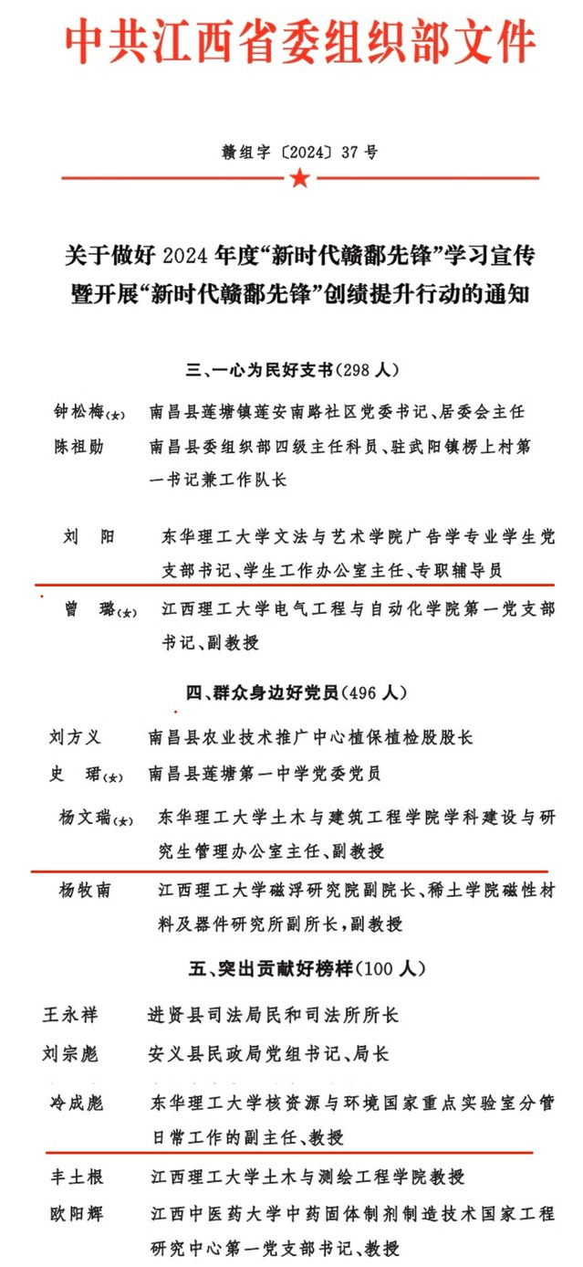 近日,省委组织部下发了《关于做好2024年度“新时代赣鄱先锋”学习宣传暨开展“新时代赣鄱先锋”创绩提升行动的通知》(赣组字〔2024〕37号),公布了2024年度“新时代赣鄱先锋”学习宣传人选名单,东华理工大学冷成彪、杨文瑞、刘阳3名教师被确定为全省2024年度“新时代赣鄱先锋”学习宣传对象。
