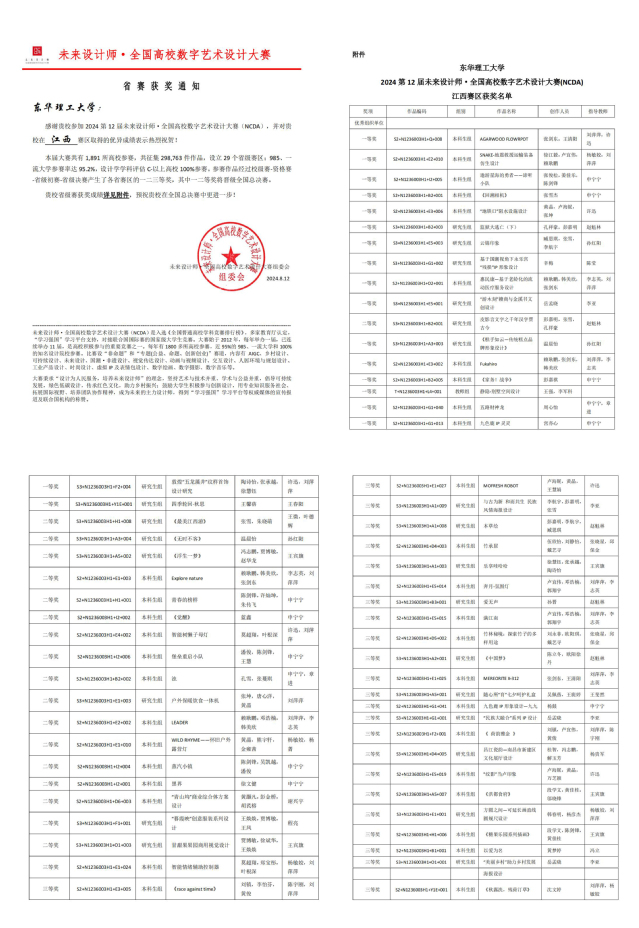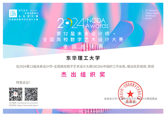 近日,东华理工大学美术与设计学院学生在第十二届未来设计师·全国高校数字艺术设计大赛(NCDA)全国总决赛中获一等奖2项、二等奖3项、三等奖6项,学校获评全国杰出组织奖;在江西省赛区评比中,获一等奖18项、二等奖18项、三等奖25项,学校获评江西省赛区优秀组织奖。学校在此次大赛中获奖数达72项,是参加该项赛事取得的历史最好成绩。
