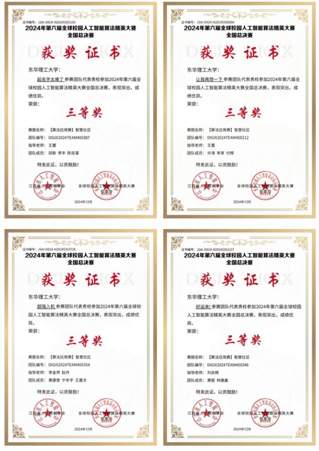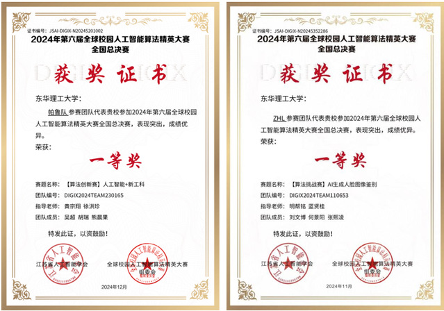 由东华理工大学吴超、胡瑞、熊晨果组成的学生代表队获“算法创新赛-人工智能+新工科”赛道全国一等奖;刘文博、何景阳、张熙凌组成的学生代表队获“算法挑战赛-AI生成人脸图像鉴别”赛道全国一等奖,创造了学校在该项赛事的历史最好成绩。