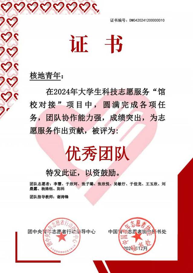 近日,中国青年志愿者协会、中国科学技术协会宣传文化部公布了大学生科技志愿服务“馆校对接”项目优秀成果评选结果。东华理工大学地球科学学院核地青年志愿服务队获评优秀团队,李慧、刘晨露等10名同学获表彰。