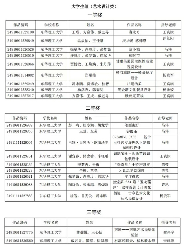 近日,江西省第十二届“艺德杯”师生艺术作品展示活动圆满落幕。东华理工大学获大学生组(绘画类)一等奖1项、二等奖2项、三等奖1项;大学生组(摄影类)三等奖1项;大学生组(艺术设计类)一等奖9项、二等奖9项、三等奖9项;学校获“优秀组织奖”。