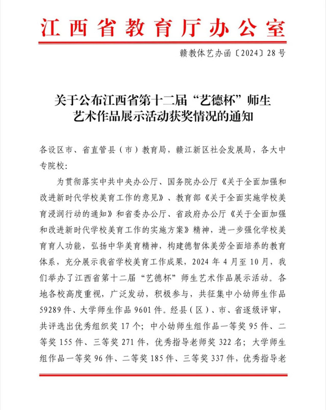 江西省第十二届“艺德杯”师生艺术作品展示活动由江西省教育厅主办,主题为“共庆华诞谱新篇,同感师恩绘未来”。该活动受到各地各校的高度重视,共征集中小幼师生作品59289件、大学师生作品9601件。此次学校获奖,不仅是对参赛师生辛勤付出的最好回报,也是对学校美育教学工作的充分肯定。(文/徐文佳 李怡芬 图/孙仪静)