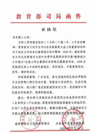 近日,教育部语言文字应用管理司和共青团中央青年发展部联合致函东华理工大学,对东华理工大学在2024年“推普助力乡村振兴”全国大学生暑期社会实践志愿服务活动的突出表现予以表扬,充分肯定了学校师生在助力推广普及国家通用语言文字,促进铸牢中华民族共同体意识中作出的贡献。